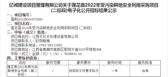 熱烈祝賀我公司2022年5月17日喜中《江西省蓮花縣2022年受污染耕地安全利用采購(gòu)(二標(biāo)段)項(xiàng)目》。